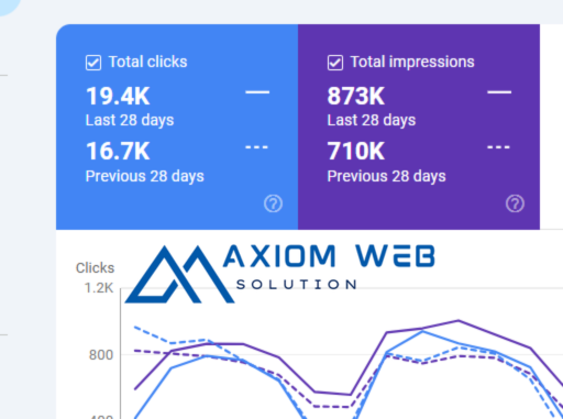 At Axiom Web Solution, we use Google Search Console to track performance and refine our SEO strategies. In the last 28 days, 19.4K clicks (up 16%) and 873K impressions (up 23%) compared to the previous period—showing strong growth in both visibility and user engagement. This data proves our SEO efforts deliver measurable results for our clients.